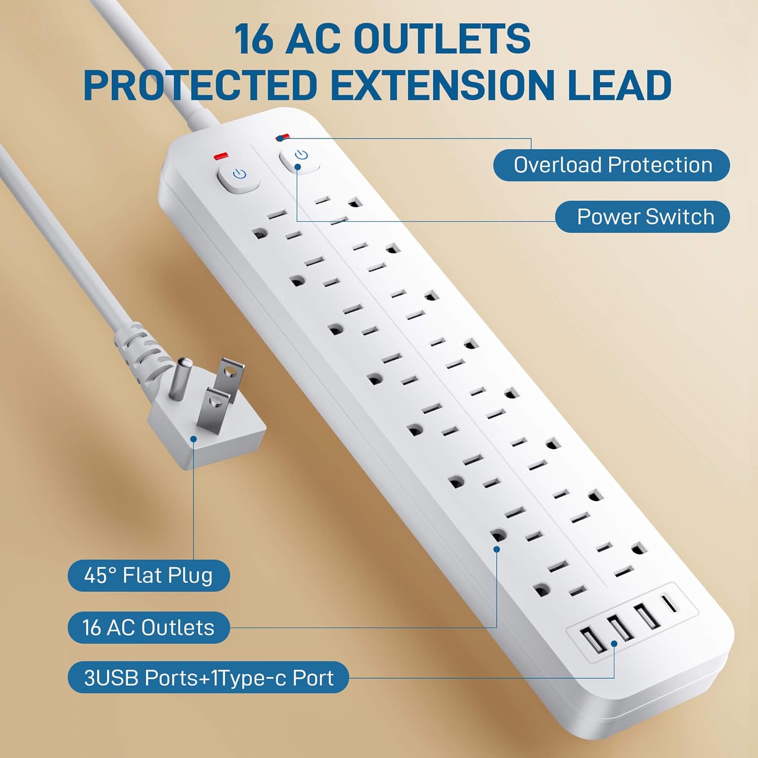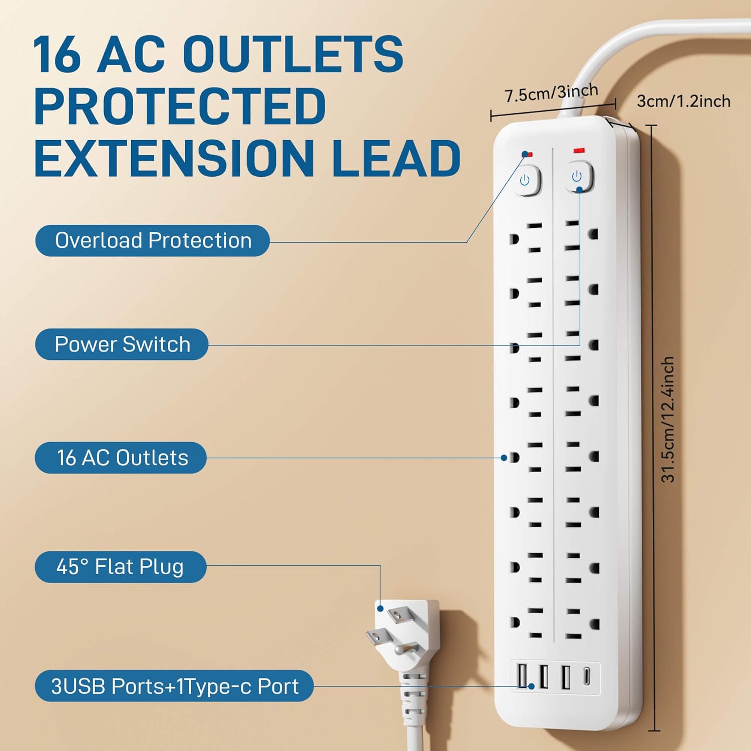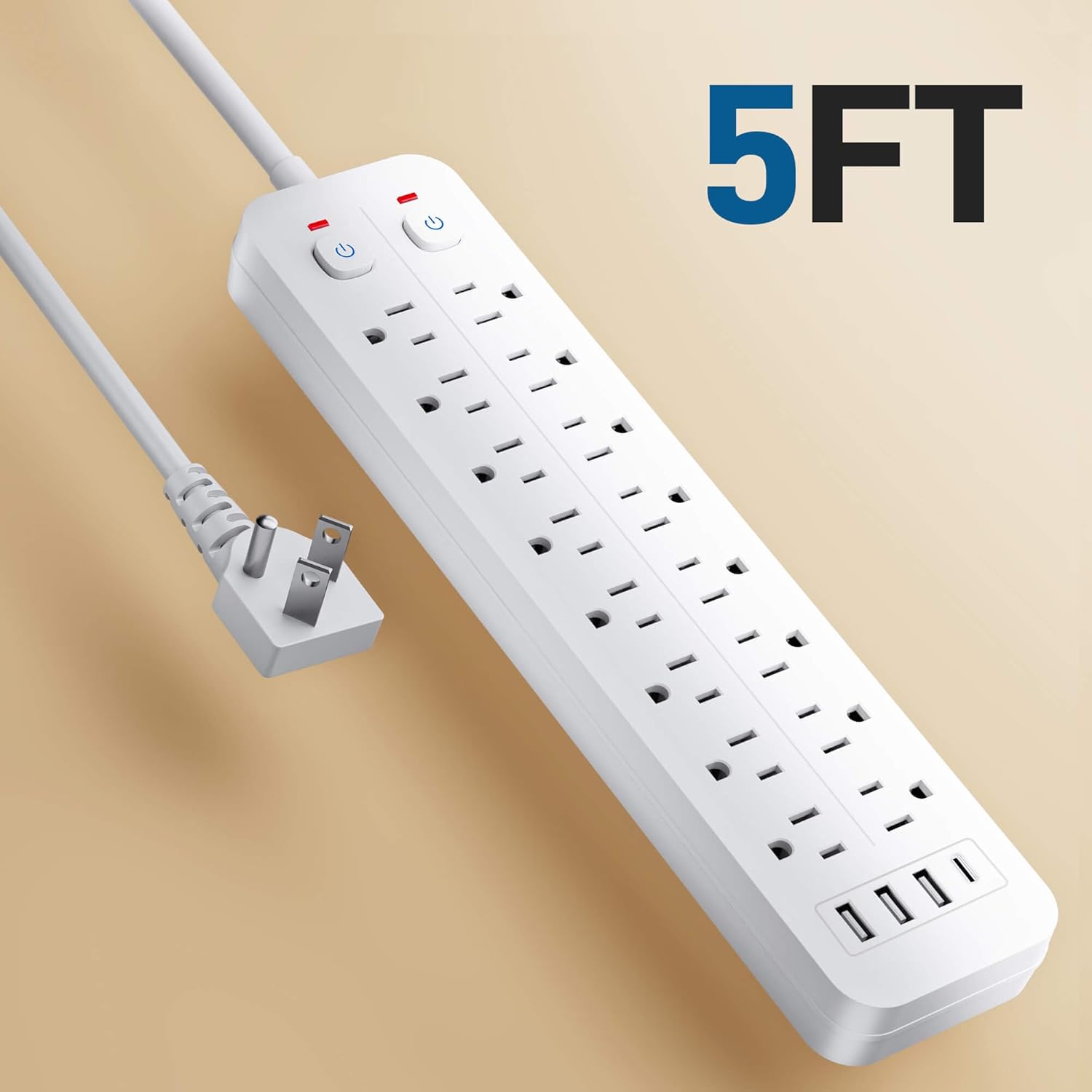 Flat Extension Cord: With a slim 0.7-inch flat head design, this power strip can easily fit into tight spaces, such as behind sofas and beds. The 45° angled design ensures that bottom plugs are not blocked, and the 5-foot heavy-duty extension cord offers superior current-carrying capacity