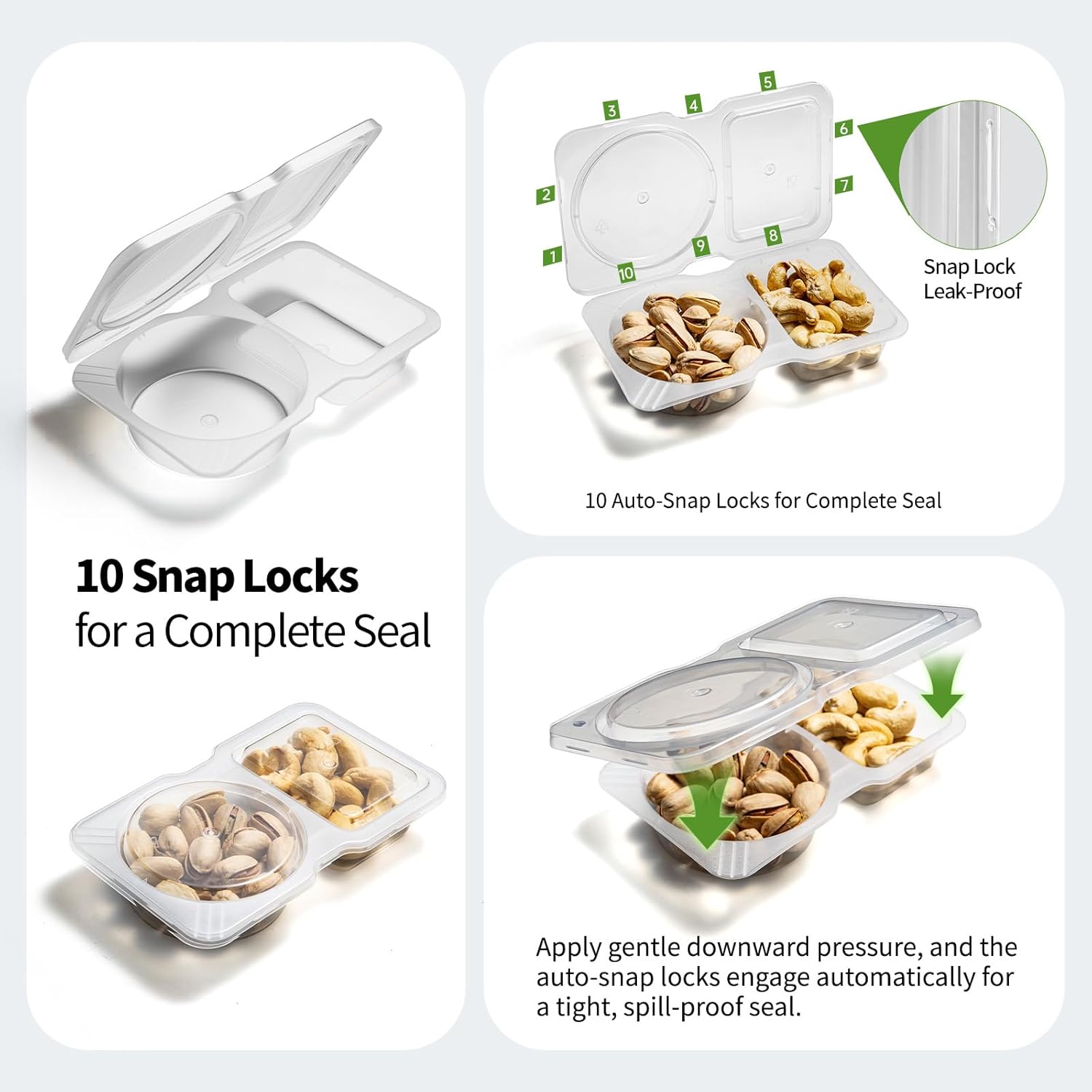 【Double Compartment Design for Smart Portion Control】Each snack container features two compartments to separate different foods or dips—ideal for portion control, bento-style packing, or pairing sauces with veggies, crackers, or fruits. Great for balanced, organized meals.