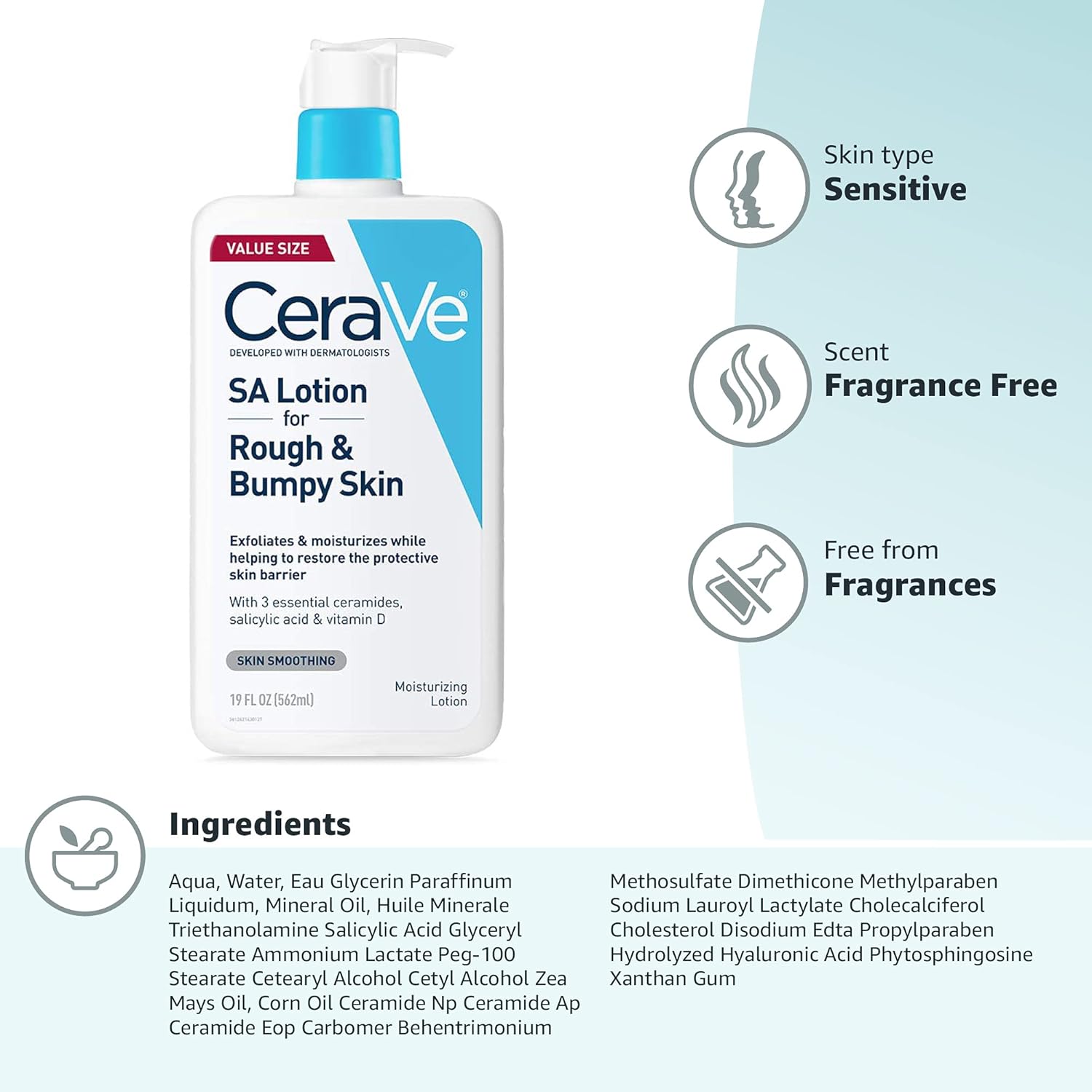 CeraVe SA Lotion for Rough & Bumpy Skin, Vitamin D, Hyaluronic Acid, Lactic Acid, Niacinamide & Salicylic Acid, Gentle Exfoliating Rough And Bumpy Skin Lotion, 19 Ounce