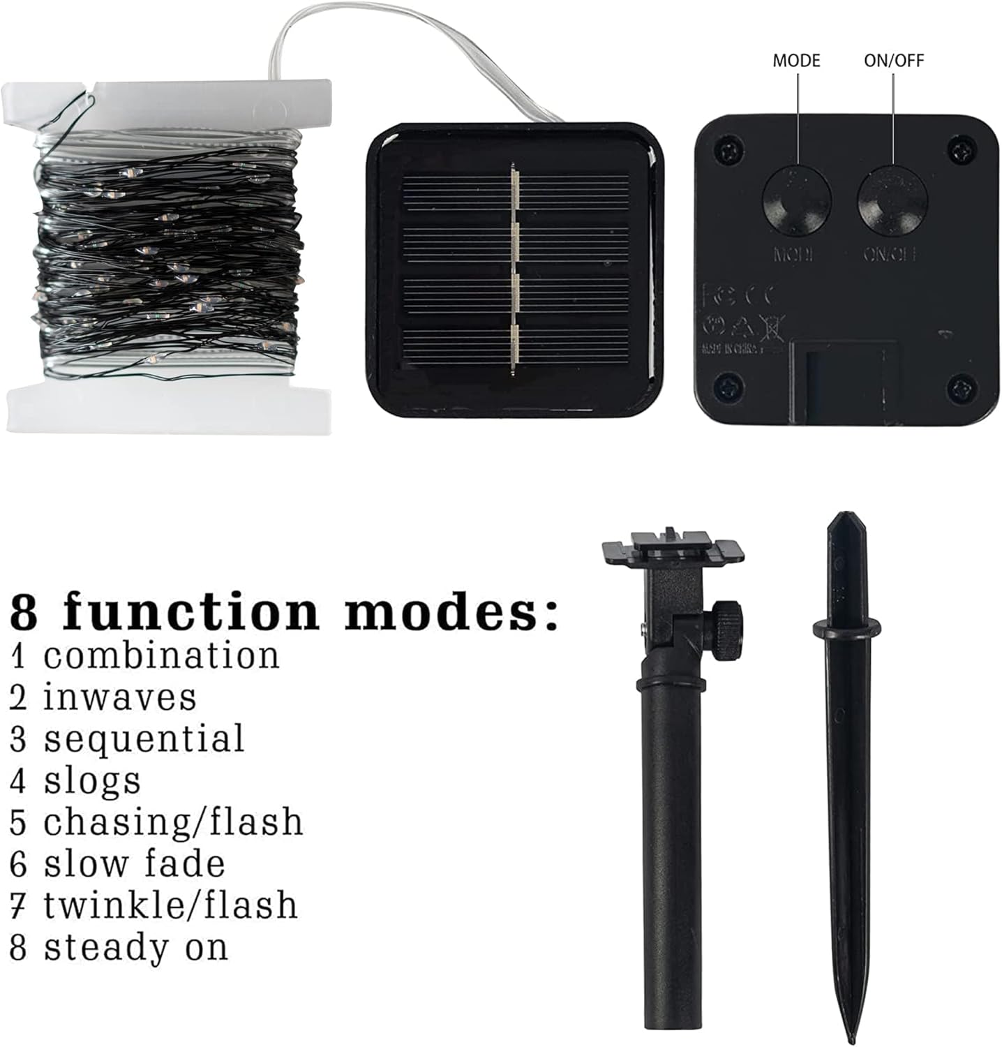 SPECIFICATIONS LED Quantity: 120 LED Leading Wire: 6.5 FT Light String Length: 39.4 FT Total Length: 45.9 FT Bulb Spacing: 3.9 inch IP44 Waterproof Power Supply: Solar Powered Package Include: