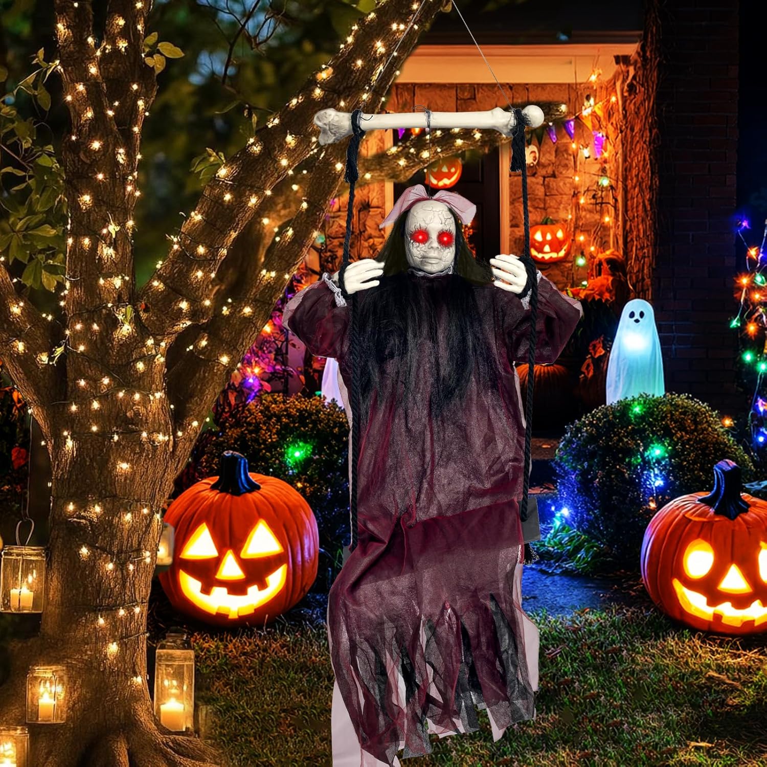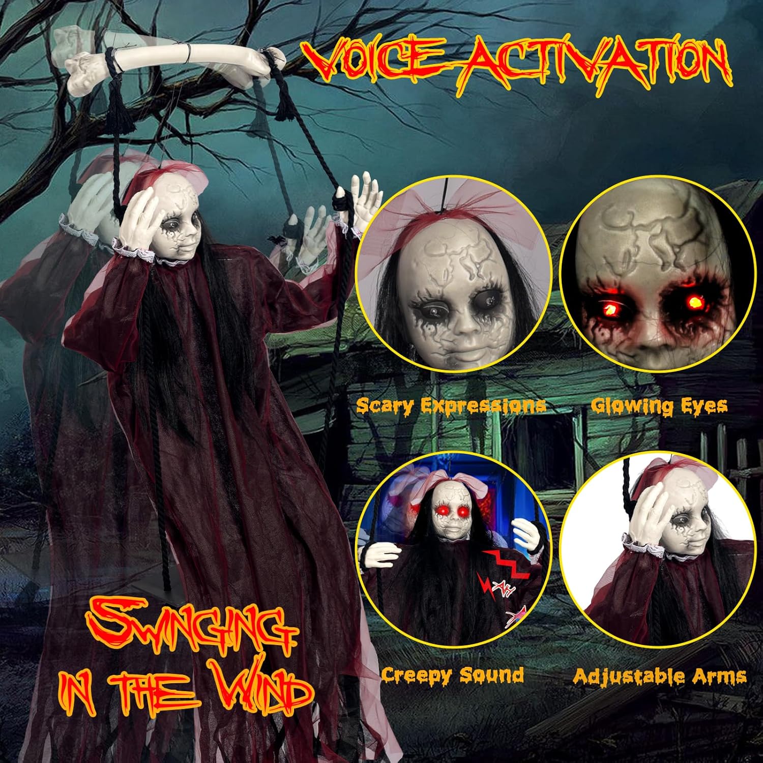 【Spooky Halloween Decorations】This creepy swinging doll features red LED eyes, a scary voice, black hair, and a bloodless face, swinging in the wind in a flowing robe, providing the ultimate sensory impact, making your Halloween vacation both scary and exciting. The hanging swing girl is perfect for Halloween decorations outdoor and indoor, and the best Halloween gift.