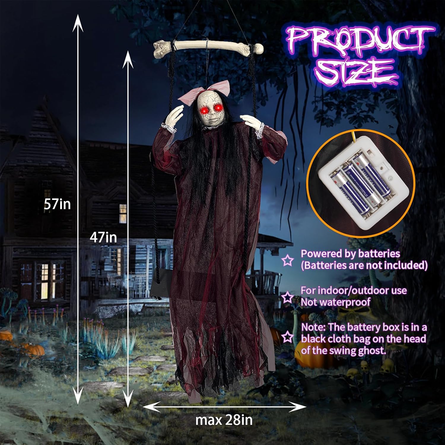 【No Need to Install Design】Our Halloween hanging ghost adopts an all-in-one design with no complicated installation steps. When you open the package, just hang it anywhere you want, such as in the front yard, porch, living room, garden, patio, trees, or doorway. The Halloween animatronic decoration is powered by batteries for convenient usage. (Please note: Battery not included in package)