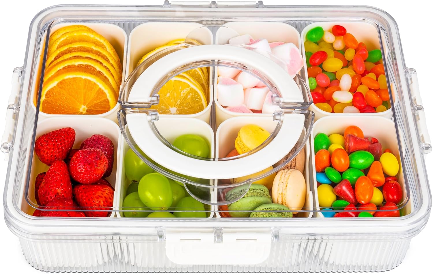 UNIQUE DESIGN - Snack tray with lid is designed with ribbed exterior, looks retro and elegant. Snack tray comes with handles for easy carrying, a clear lid with 4 locking clasps and sealing silicone ring to avoid food spills and keep it fresh.